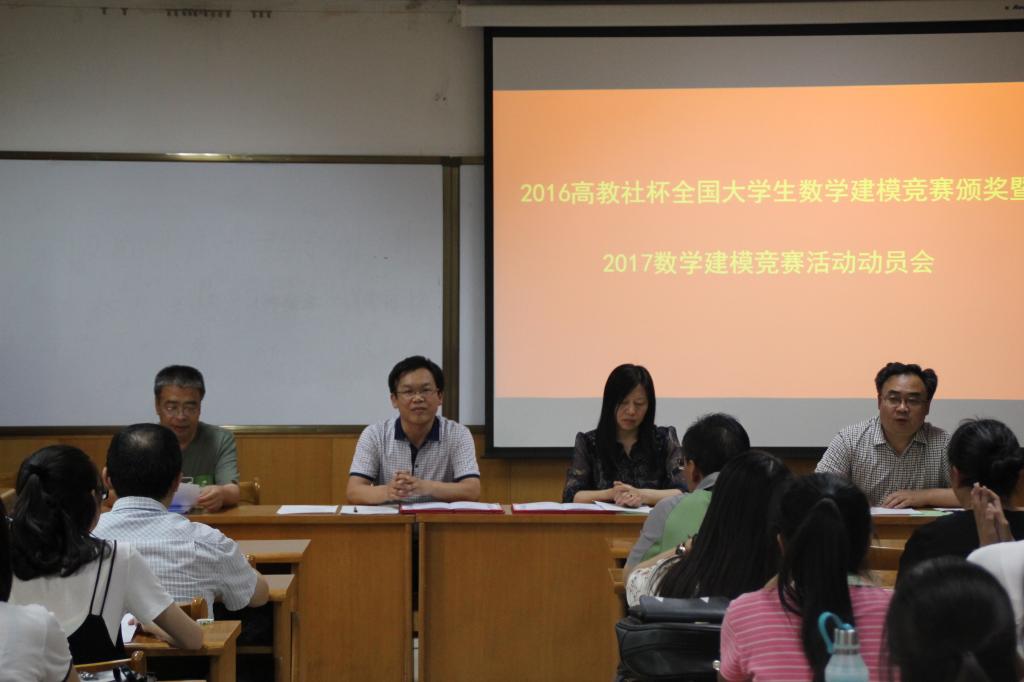 2017年6月12日晚7点半,我院在科学会堂A710报告厅召开了2016高教社杯全国大学生数学建模竞赛颁奖暨2017数学建模竞赛活动动员大会。院党委书记郝红霞,院长史建红,副院长朱红康、安立坚、王洁以及2016数学建模竞赛教练组全体教师、同学参加会议。会议由副院长朱红康主持。