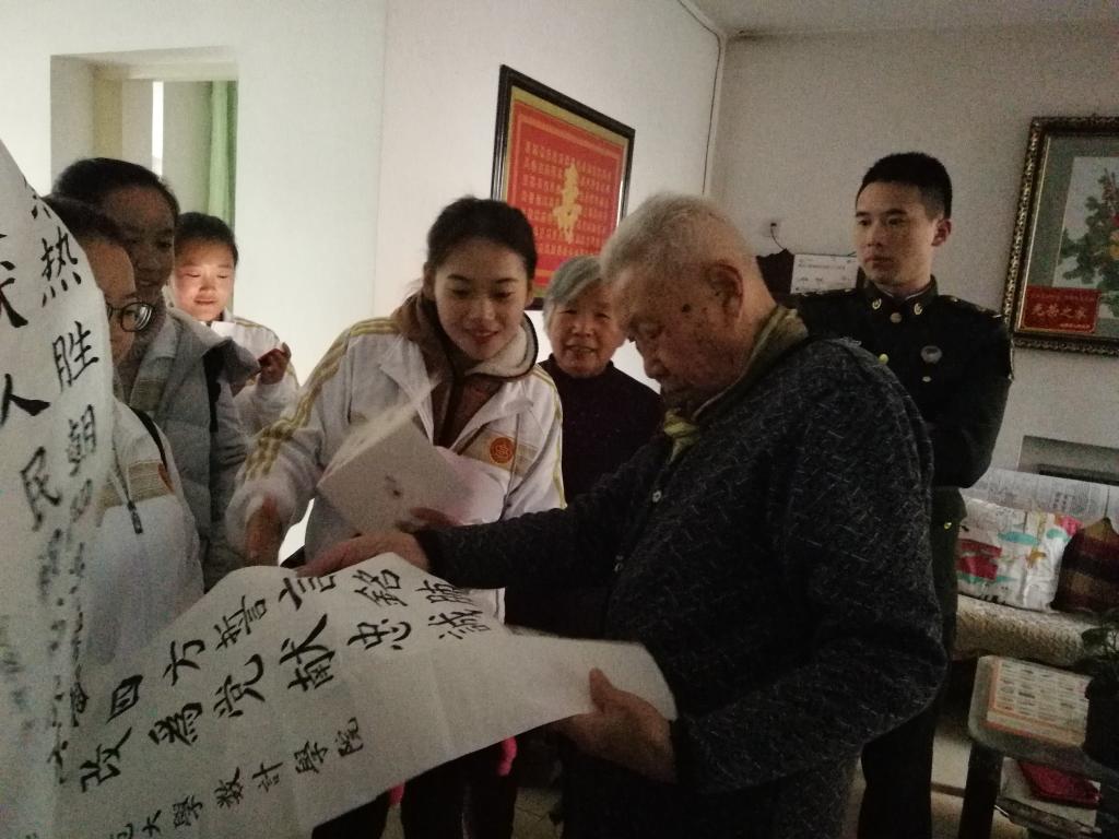 在干休所负责人的带领下,志愿者们分组进家户慰问老兵们,送上亲手制作的贺卡以及书法作品,聆听他们讲述抗战故事,重温民族记忆。老兵们虽年事已高,却精神饱满、声音洪亮地为学生们讲述那个烽火年代的故事,英勇无畏的精神感染了大家,也让所有人深刻地认识到当下幸福生活的来之不易。