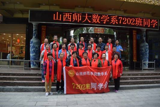 2015年他们在宁武举行毕业后第一次奔七大聚会,创编了队歌,制定了一年一大聚、各地轮流组织的聚会形式,同时在太原举行和班主任王民汉共叙师生情的聚会;2016年他们在运城和数学系原书记赵北烁老师进行历时五天的相聚,成立山西师大数学系7202班同学会,建立队旗;2017年他们在长治相聚;2018年他们相聚母校,在晚会上老班长陈花果发言致辞,她表示毕业43周年了,他们已经聚会5次,每年轮流到一个地方聚会,都要把当地的代课老师请来,和同学们一起畅谈大学生活。大家入校前大都是农民,师大为他们提供了成长的平台,奠定了良好的基础,才有机会参加工作,退休了领着国家工资,享受着国家退休人员的优厚待遇,感谢师大,感谢母校,感谢老师。院党委书记郝红霞表示,这些老校友回母校聚会,他们大多是老师,他们40多年为社会创造了价值,为基础教育培养了很多优秀学子,为高等学府培养人才打下了坚实的基础,母校以他们为荣,师大新校区建设即将开工,希望老校友以后能再聚新校区。