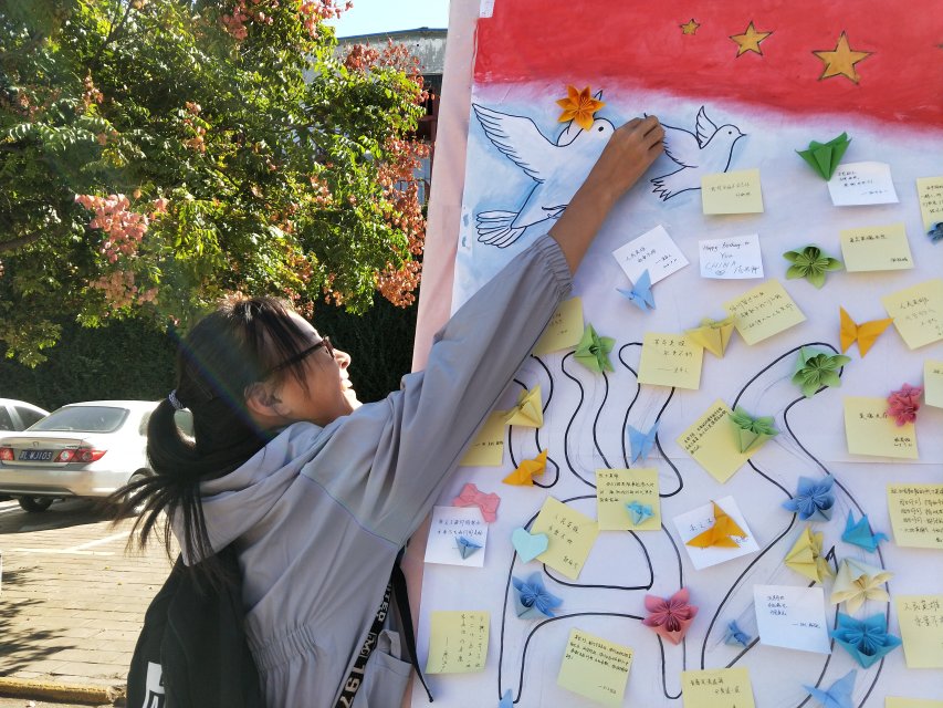 太阳初升,青协志愿者便开始在校医院门口搭帐篷、挂条幅、放展板,装扮现场活动,一切都在紧张筹备中。 活动刚开始,青协志愿者向路人讲述胡兰、毛岸英、董存瑞等革命烈士的英勇事迹,参与活动的学生根据相关事迹来选择正确的英雄人物,并将其对号入座。志愿者们通过饶有趣味的小游戏帮助大家铭记革命先烈,传承红色记忆。此外,青协志愿者为参与者提供彩纸,并现场教授千纸鹤折法,大家把亲手折叠的千纸鹤粘贴在事先准备的烈士纪念日主题展板上,五颜六色的彩纸、生动别致的千纸鹤粘贴在一起,拼接出“烈士纪念日”五个鲜红的大字。志愿者还动员大家在便利贴上写下自己对烈士的寄语和对自身的期望一并粘贴在展板上。最后,志愿者们为每位参与者发放活动纪念品,并合影留念。活动接近尾声,展板已被贴得满满当当,彩色的展板代表着学生们对革命烈士的尊敬和怀念,象征着大家飞扬的青春梦想,承载着时代新人肩负的历史使命。
