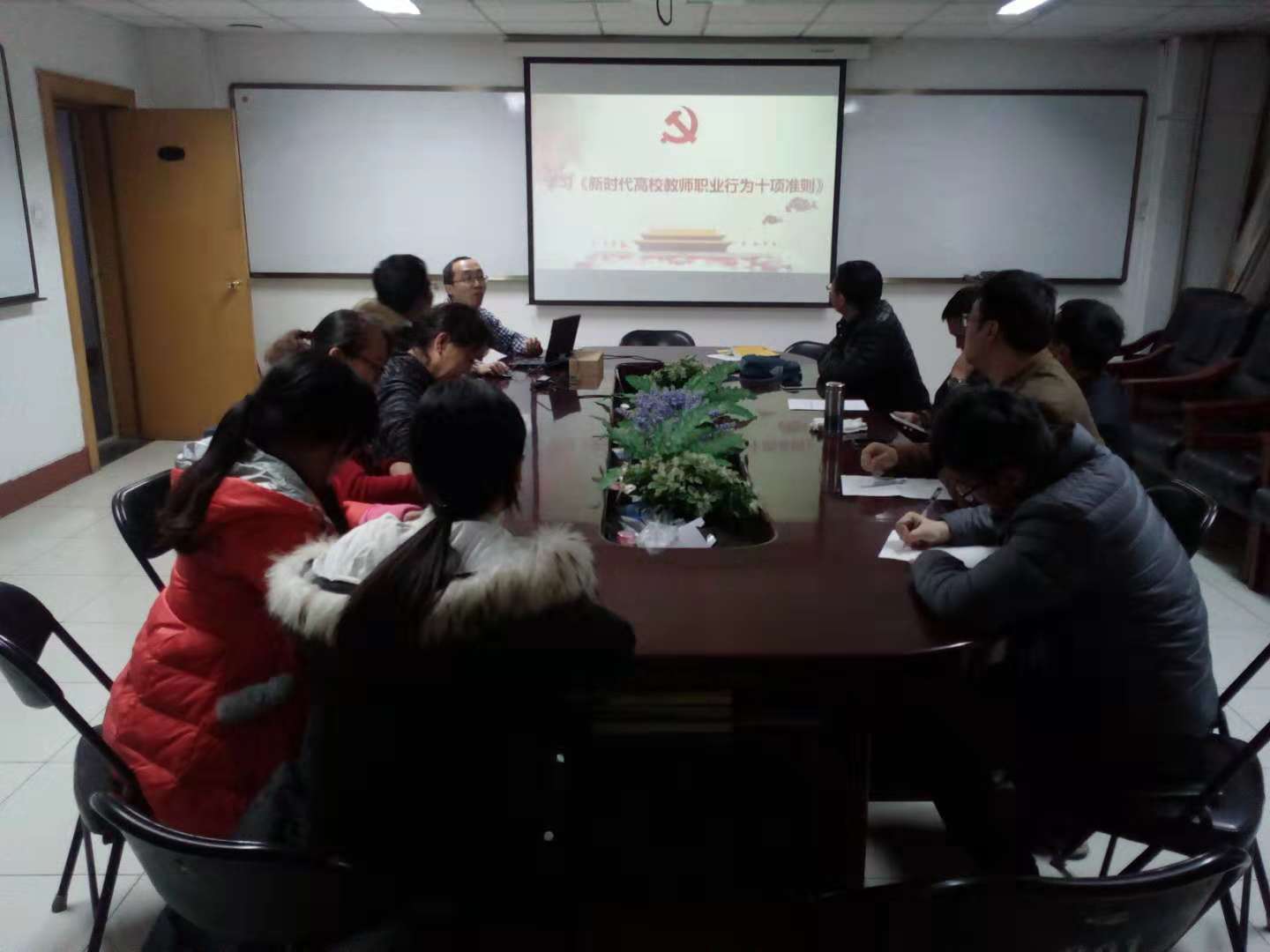 党委在收到校党委的文件时,第一时间召开中心组专题学习会议,传达了学校《关于认真开展<新时代高校教师职业行为十项准则><新时代中小学教师职业行为十项准则><新时代幼儿园教师职业行为十项准则>学习活动的安排意见》,系统学习了《新时代高校教师职业行为十项准则》和《关于高校教师师德失范行为处理的指导意见》,学习了《准则》出台的时代背景、重要意义、文件精神、准则具体内容和失范行为处理意见等内容,明确了高校师德“红七条”与《准则》的联系,并通过典型案例加强警示教育。