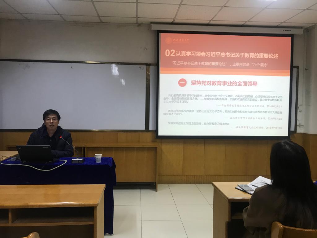 党委书记院长赵跃先教授在科学会堂710报告厅做了“贯彻习近平总书记关于教育的重要论述,培养社会主义建设者和接班人”的讲座。我院党委书记郝红霞主持,全院教职工认真听取了讲座。